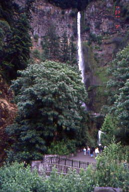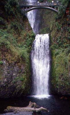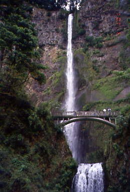 Next was Multnomah Falls. Spanning two tiers on basalt cliffs, it is the tallest waterfall in the state of Oregon at 620 feet. The Multnomah Creek Bridge, built in 1914, crosses below the falls, and is listed on the National Register of Historic Places. The land surrounding the falls was developed by Simon Benson in the early-twentieth century, with a pathway, viewing bridge and adjacent lodge being constructed in 1925. The Multnomah Falls Lodge and the surrounding footpaths at the falls were added to the National Register of Historic Places in 1981.