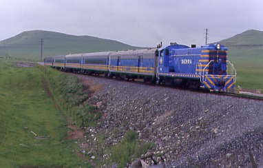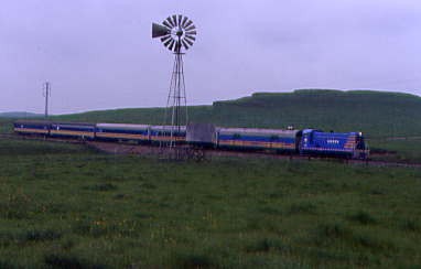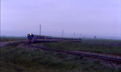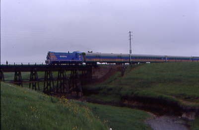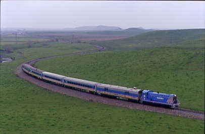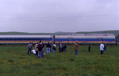 San Joaquin 716 3/13/05Our train arrived at 3:29 PM and departed four minutes later at 3:33 PM {3:25 PM}. Ken's 3751 hat flew off his head but he retrieved it before we departed. Our train, in push mode, had Pacific Surfliner-style cab car 6961 "Point Arguello", Pacific Surfliner-style coach 6463 "Muir Beach", café 8810 "Owens Valley", coach 8011 "Yuba River" with engine CDTX F59PHI 2004. We made our way south to Turlock/Denair, departing there at 3:45 PM {3:38 PM} and I relaxed on the way to Merced, departing there at 4:10 PM {4:03 PM}. We met San Joaquin 715 waiting in the siding at Planda then Ken and I went to the café for dinner with me having a hot dog and Ken have a Chef Mario chicken dinner, which was heated properly this time. Anthony, our Café Lead Service Attendant, has to be the best one I have had in all of my 852,000+ rail miles. He can take three different orders at once and make not a single mistake. He checks up on you and keeps his car very clean, taking true pride in the service he provides.
