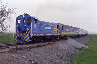 Sierra Railroad 42's builder's plate. The complete consist of our train was S-12 42, baggage generator car, "Nevada Falls", "Yosemite Falls", half dome and "El Capitan". Today we had a total of 43 passengers aboard our Railfan Special and Ken and I boarded the half dome at 7:15 AM and departed at 7:30 AM. Steve Sedaker was seated across the aisle at a table and was great company on this trip.