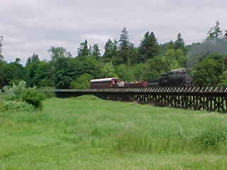 The train then reversed to the west end of the South Fork of the Chehalis River trestle, where we all detrained for our sixth and last photo runby of the trip. To reach my photo location, I had to walk through grass taller than I was to a higher location in order to shoot over the grass.