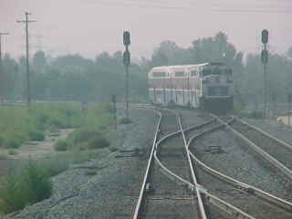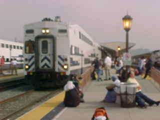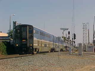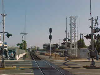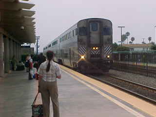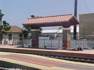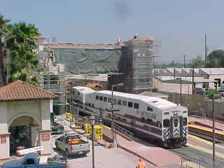 Metrolink 807 8/17/2006I drove down to the station and parked in the northwest lot before buying my Metrolink tickets for the day then waited for Metrolink 807 to take me to Tustin to meet with Winston Walker. The train arrived on time and I boarded for the 4.3 mile journey then detrained and found Winston waiting for me. We walked under the tracks and up the ramp to Track 1. A unique feature of this station is that when I wait for westbound trains, they can be seen for miles in the distance as they approach.