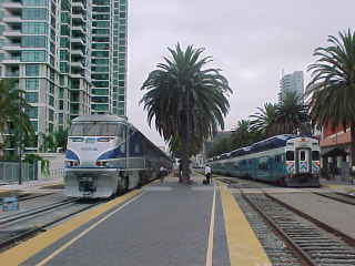 As I waited, various San Diego Trolley trains kept passing the station. Pacific Surfliner 769 was boarded at 9:18 AM with our doors still closed so no Amtrak passengers would board by mistake. The Coaster crew boarded the cab car at 9:22 AM then opened the doors with no announcement being made.