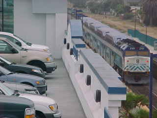 This train had F40PH-3C, coaches 2206, 2201, 2402 and 2502 along with cab car 2302. I chose an upstairs table seat so I could write the story as went north to Oceanside. At 9:25 AM came the announcement "This is the northbound Coaster to Oceanside departing at 9:45 AM". It was interesting to watch the comical last-second boarding of Pacific Surfliner 769 which departed a few minutes late, as the crew was waiting for their last minute arrivals to board. At 9:42 AM, the announcement "This is the northbound train to Oceanside departing at 9:45 AM for Old Town, Sorrento Valley, Solana Beach, Encinitas, Carlsbad Poinsettia, Carlsbad Village and Oceanside" was heard and three minutes later, "Doors are closing, stand clear!"