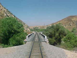 The west portal of Tunnel 25. We met Metrolink 212 before arriving in Newhall and saw the Union Pacific Saugus local switching before turning the corner on our way east to Santa Clarita. We ran onto Via Princessa and after departing, a second security announcement was made then proceeded on the most scenic part of the line through Soledad Canyon.