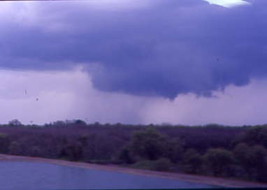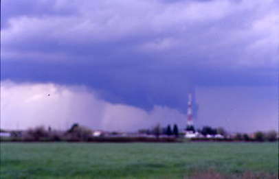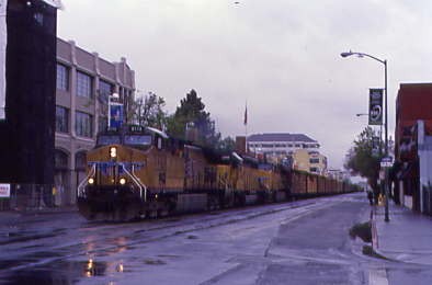 On the way, we spotted this cloud trying to form a tornado. My camera was out and ready just in case it did. We then heard a report that a BNSF Remote Control Unit had derailed east of the Bakersfield yard and the afternoon became more interesting as we turned northwest into Riverbank and headed into the storm. It really poured, complete with flashes of lightning. At East Stockton, we passed a late-running San Joaquin 716 before arriving at Stockton.
