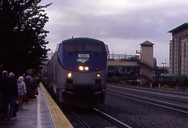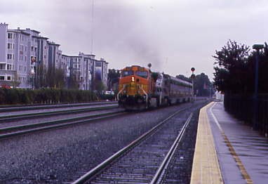 Oakland 4/1/2006 After another waterfall shower, I checked e-mail before joining Chris for a continental breakfast then we checked out and walked to the station in a light rain. While Chris was buying his ticket to Emeryville, I heard a train approaching.