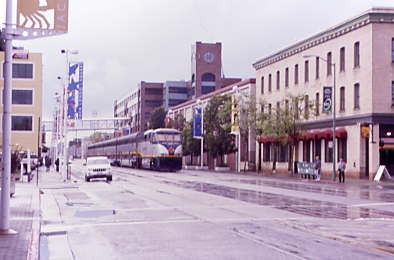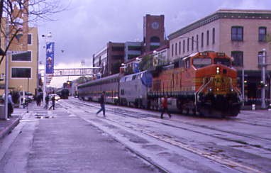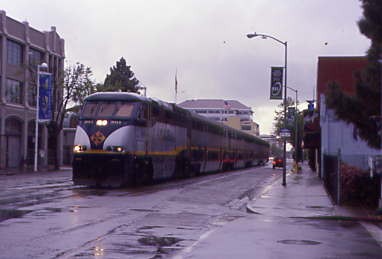 Santa Fe Stockton station built in 1900. We then crossed the California Delta and proceeded to Antioch as the rain continued to fall but it let up as we stopped at Martinez and the clouds became interesting as we continued west down the Carquinez Straits to San Pablo Bay, which was beautiful in today's unique light. The train stopped at Richmond, passed through Berkeley and on to Emeryville, where we passed the Amtrak coach yards and went down the middle of the street at Jack London Square, arriving at Oakland at 5:18 PM {4:25 PM}. We said goodbye to Conductor James and started walking to the Jack London Inn.