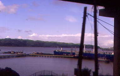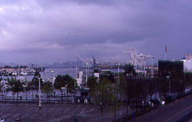 The western hills across the San Francisco Bay. We ate at Tony Roma's, where I enjoyed a steak while watching the trains pass through Jack London Square then returned to the hotel by way of the former Western Pacific station. We watched the History Channel's program about Saddam Hussein and his link to the Nazis of Germany. It was a fascinating program and I learnt more about several present and past issues, as the trains rolled by outside our window. I then had a waterfall shower and called it a night.