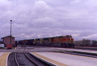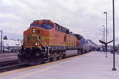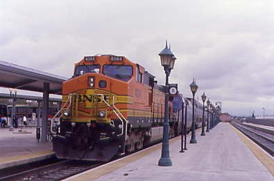 San Joaquin 713 3/31/2006This train featured BNSF C44-9W 4084, Amtrak P42DC 160, coaches 8009 "Santa Ana River" and 8007 "Russian River", café 8003 "San Gabriel Valley" and cab car 6964 "Point Arena". A compression failure on the P42DC was the reason the BNSF locomotive was on the point. We departed on time, running to Wasco, where a new station was being built. North at Elmo, we passed through the siding around a BNSF eastbound freight and at Allensworth, met Amtrak San Joaquin 702 in the siding waiting for us. We stopped in Corcoran, Hanford and Fresno.