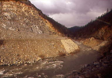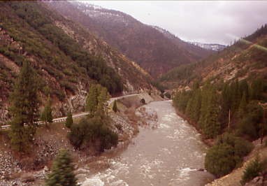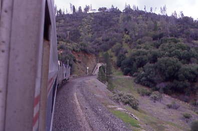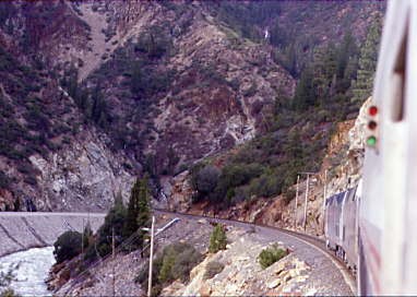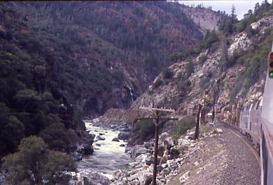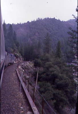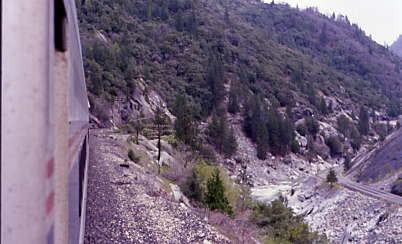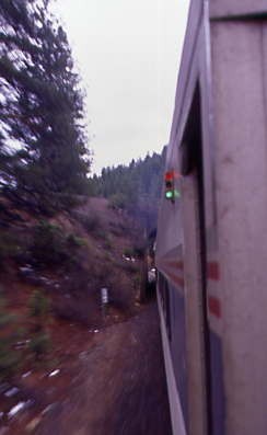The Feather River Canyon between Pulga and Merlin. At Merlin, we ran through the siding to get by a hi-rail truck with its right wheels between the rails.