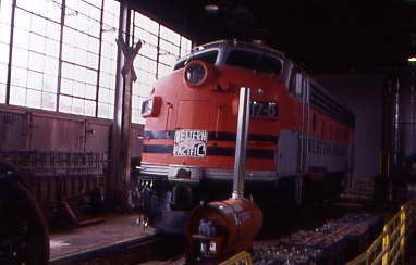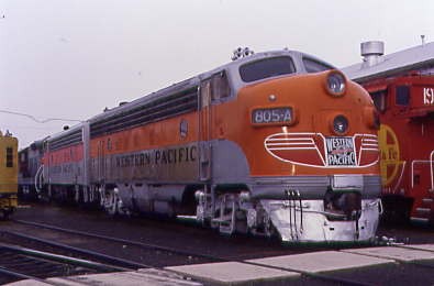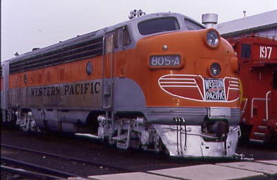 Western Pacific FP7 805-A built by Electro-Motive Division in 1955 as part of an A-B-A set of 2 "cab" units and 1 cabless "booster" units for the road's flagship "California Zephyr" passenger train. General Electric sold the unit to the Wellsville, Addison and Galeton Railroad in Pennsylvania. After that railroad was abandoned in 1977, the 805-A was transferred to the Louisiana and Northwest Railroad in Louisiana, where it was used until it was in need of an overhaul. The Feather River Rail Society wanted this locomotive for its Western Pacific Railroad collection as it had become the last WP California Zephyr locomotive in existence.