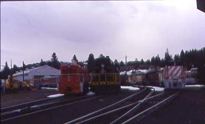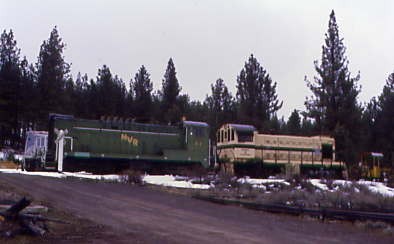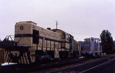 On the left is Napa Valley Railroad DS-4-4-660 51, nee Morrisey, Fernie & Michel Railway 1 built by Baldwin in 1946. It worked for the Crows Nest Pass Coal Company in Canada then began its well-travelled list of jobs by working at the Delta Alaska Terminal in Vancouver, British Columbia, then crossed the border and was renumbered to Seattle and North Coast 51. Following the closure of the Seattle and North Coast railroad, the unit was leased to Publishers Paper Company in Newport, Oregon, spent some time on the Chelatchie Prairie in Battle Ground, Washington and was moved to Sacramento for storage at the California State Railroad Museum. It was then run under its own power to Napa for use by the Napa Valley Railroad to assist in rehabilitating their trackage after its long neglect by the Southern Pacific. It was here that one of the traction motors was damaged while working a ballast train, which put the well travelled locomotive out of service and was moved to Oroville and finally to its current home at Portola.