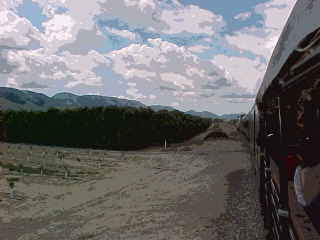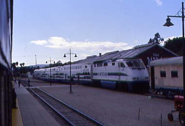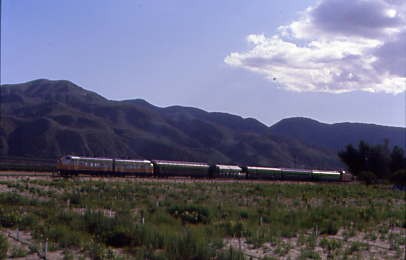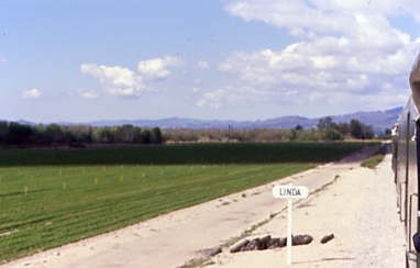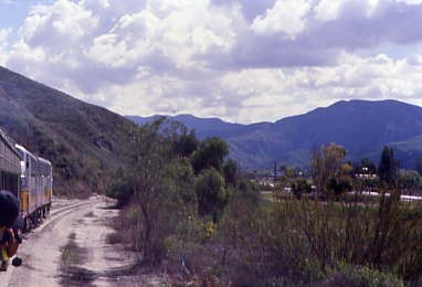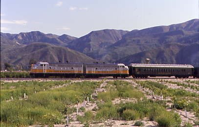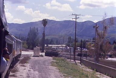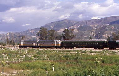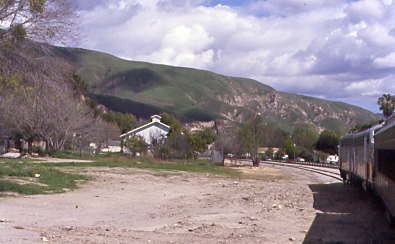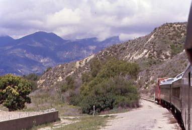 Southern Pacific passenger trains stopped using the Piru Station in 1938 and through service ended in 1953. A tunnel fire on the Coast Line returned Trains 97 and 98, the Coast Daylight, Trains 75 and 76, the Lark and Mail, and Trains 90 and 91 in early 1963. In March 1963, Golden West Tours ran a westbound trip over the line with four scarlet F-units and 14 cars. There may or may not have been others, but 43 years later, I would hopefully be on the first train to Piru.