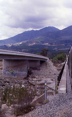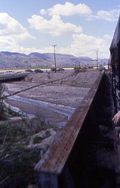 Santa Paula Creek. Chris had some really hot and spicy soup and I enjoyed a Fillmore Dog, Fritos and a Coca-Cola which took us most of the way back to Fillmore and the next thing I knew, we were crossing Sespe Creek and arriving back in town. Once we all detrained, we returned to Chris' truck and drove west to catch the train crossing the creek.
