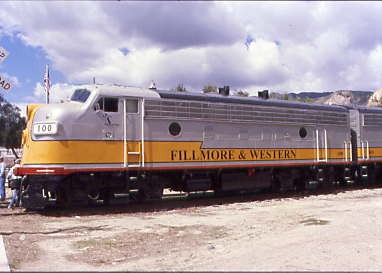 Fillmore Railfest 2006The Fillmore and Western Railway is a railroad owned by the Fillmore and Western Railway Company. The company operates on track owned by the Ventura County Transportation Commission. The majority of F&W rolling stock was acquired from three major studios: 20th Century Fox, Paramount, Warner Bros and MGM. The rolling stock and right-of-way are frequently used for the filming of television series, motion pictures and commercials and as a locale for private and commercial still photography. Visitors to Fillmore often see filming activity as well as sets and support equipment at the company's rail yard and along the tracks between Santa Paula and Piru.