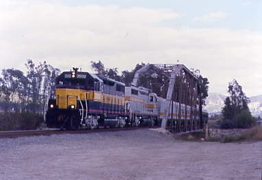 HistoryThe track is a standard gauge railroad constructed in 1887 by Southern Pacific Railroad through the Santa Clara River Valley in Ventura County, California. This line was originally part of the Southern Pacific's main line between San Francisco and Los Angeles before a shorter route was built through the Santa Susana Mountains in 1904. State Route 126 follows roughly the same route from Ventura to Santa Clarita. The track was used extensively by Southern Pacific as late as the 1950s to haul citrus from packing houses at the communities along the Santa Clara River. In 1989, the branch line that connects at its west end to the Union Pacific at Montalvo in Ventura was purchased from Southern Pacific by the Ventura County Transportation Commission. The eastern end of the line now terminates in Piru as storm damage in 1979 severed the eastern end of the line to Saugus in Los Angeles County.
