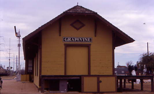 Across the highway was the former St. Louis-Southwestern Grapevine station built in 1901 and was in opertion until 1972 when the station was closed. Through the efforts of the Grapevine Garden Club, the Depot was saved from demolition and moved to Heritage Park at Ball and Wall Streets, where it remained for 20 years. In 1972, the Grapevine Historical Society was organized to utilize the Depot building for a new museum to preserve Grapevine's unique history and heritage. Twenty years later, the Depot and the Grapevine Historical Museum moved back to Main Street near the railroad tracks on land that is now called the Heritage Center. The Depot is the ticketing site of the Grapevine Vintage Railroad.