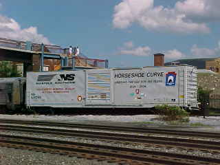 Norfolk Southern box car 658265 with "Railroaders Memorial Museum Horseshoe Curve Bridging the Gap for 150 Years" was on display.