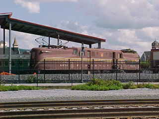 Also on display was Pennsylvania Railroad GG1 4913 built by the railroad in 1942. This was one of 139 such locomotives built for the PRR's 11,000 volt electrified New York, Washington and Harrisburg routes, the busiest lines in the United States. 4913 saw many miles pulling the Pennsy's famous "Congressional" passenger train. The GG-1 type, first built in 1934, could handle 20 passenger cars at speeds up to 100 mph and is one of the most successful electric locomotive designs in the world. Some GG-1's worked in first-line assignments for nearly 50 years. No. 4913, weighing in at 237 tons, was retired in 1980 and is one of only five GG-1s to be originally painted in PRR Tuscan Red with five gold stripes.