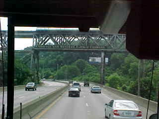 We passed under a trestle labelled "Norfolk and Western Railway Company". Next we dropped down the hill and went through the Fort Pitt Tunnel.
