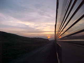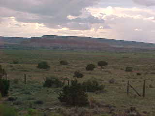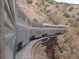 A couple of pre-dinner pictures of the red mesas of New Mexico. We stopped at Thoreau at MP 128 for an eastbound stack train and I ate my dinner in my room during a rain shower enjoying chicken fried steak, which was excellent and a chocolate bundt cake. We next lost Head End Power and I learned it was due to a cable between the baggage car and the transition car, which happened just as I had climbed into the shower, which did not work after the power was restored. I went back to my room and put on Blackmore's Night "The Village Lantern" and by the third song, we were back on the move again and made our stop at Gallup.