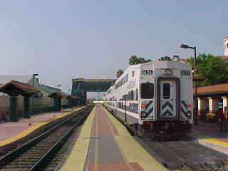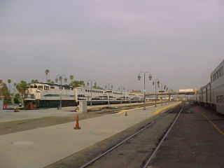 Metrolink trains waited at San Bernardino during our last fresh air stop of this trip. The Moody Blues' "Greatest Hits" took me through Riverside and on toward Fullerton.
