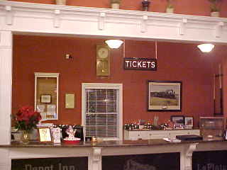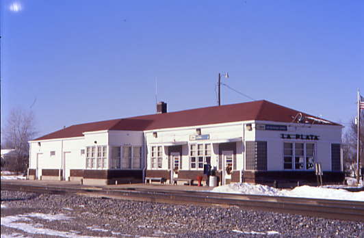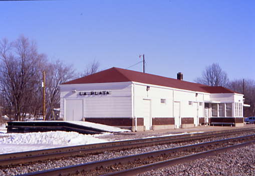 The La Plata Amtrak station from the north side of the BNSF mainline. It is a restored Art Deco style depot constructed of wood and brick. The original combination passenger and freight depot, built in 1887, was in need of replacement during World War II, but building materials were not readily available. In 1945, after a fire burned portions of the building, the interior and exterior were remodeled and modernized in the then-popular Art Deco style. The remodeling actually preserved the original building within the inner and outer layers.