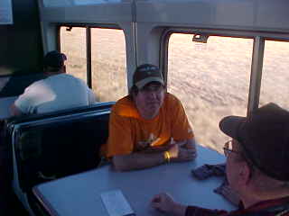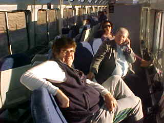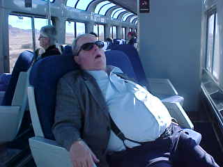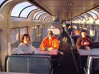 12/8/2006 I arose after Canyon Diablo and walked forward to wake up Pat, but she was already preparing for the day ahead so met her in the dining car for breakfast, and were seated with Jon Hill from Topeka, Kansas. Pat learned last night at dinner, after I left, that the other Pat from Fresno was also named Patricia Jeanne, just like her. It certainly is a small world! I enjoyed French Toast and sausage links before joining the Train Travel Meetup Group members in the lounge car.