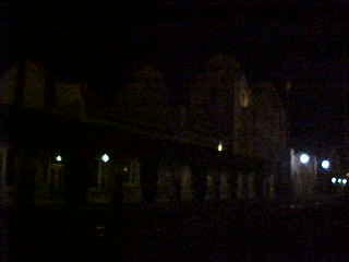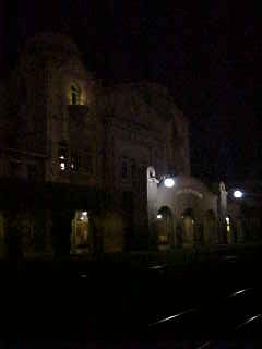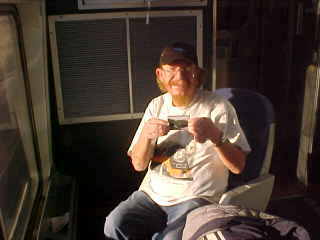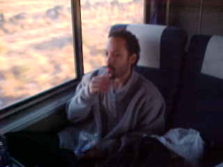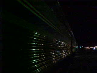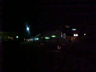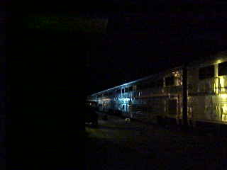 Chris was sitting at his coach seat eating a snack. It grew dark long before Raton, the next very cool fresh air break then after Raton, we were called into the dining car for dinner where I had the pork chop, Tom had the Angus burger, Dan the braised beef and Pat the cheese tortellini. I then enjoyed the sweet temptation chocolate Cake for dessert. Dinner ended at Trinidad and I returned to my room to relax and listen to Yes' "Drama". We arrived in La Junta thirty minutes early so Tom, Chris and I walked over to Safeway for more 7-UP and batteries.