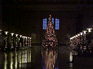 A Christmas tree inside the station and outside.