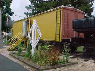 Pennsylvania Railroad caboose 477828, built by the railroad in 1942, tower and depot.