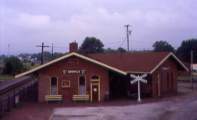 The Orville Cleveland, Akron and Columbus Railroad and Pittsburgh, Fort Wayne, and Chicago Railroad station built in 1868, as seen from the top of the tower steps.