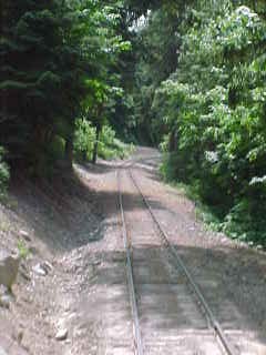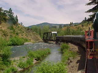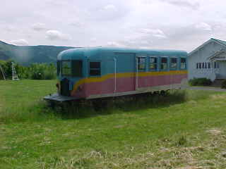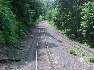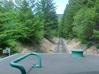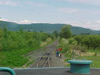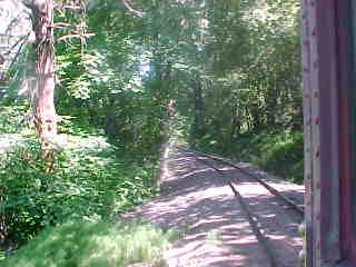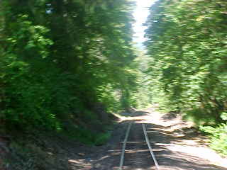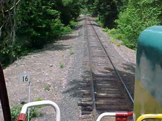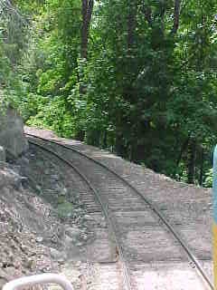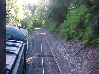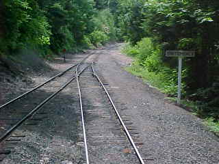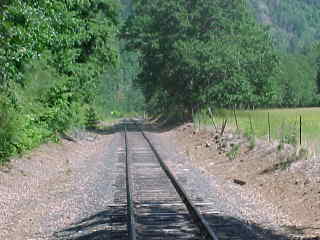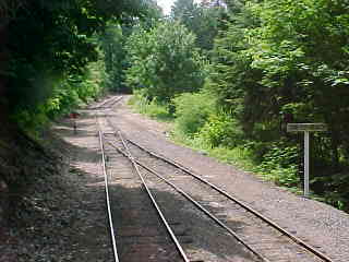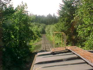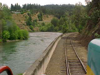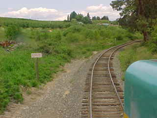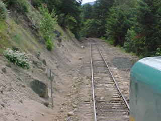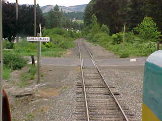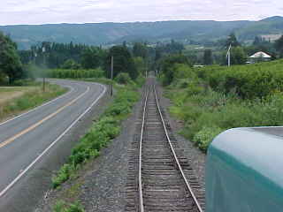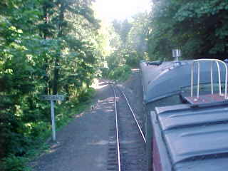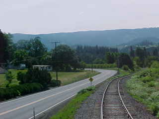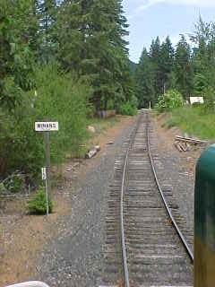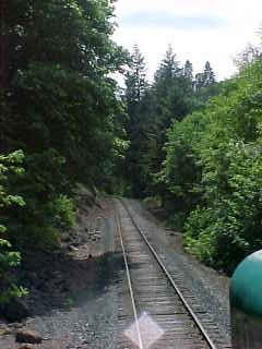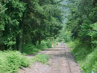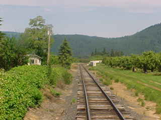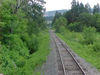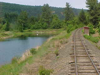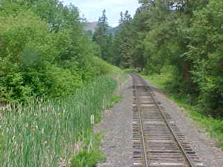 Dukes Valley at Milepost 9.4. Originally passengers were carried on the steam train but from 1916 to the end of regular passenger service in the early 1940's, a succession of jitneys, each known locally as "the Galloping Goose" ran on the tracks carrying passengers and mail only.