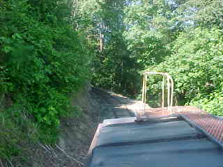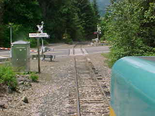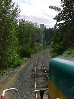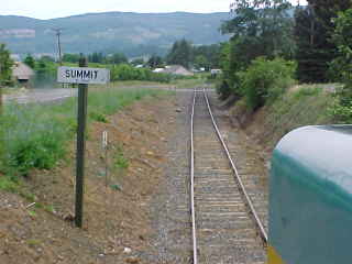A few minutes later we reached Summit at Milepost 10.5. A freight and passenger depot stood at this crossing of Gilhouley Rod, now marked by a schoolbus shelter. Near this spot in 1935, the current Galloping Goose, a 1922 Mack Railbus, burned.
