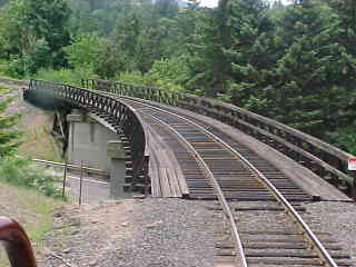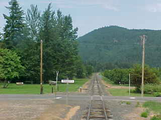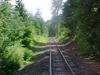 Nearing Camp No. 1 at Milepost 18.5 A loading platform for the magnificent old growth logs cut on the Oregon Lumber Company land stood here in the early 1900's. As the huge trees were cut, company yarders pulled the stumps, clearing the land for planting and settlement.