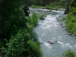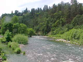 Trout Creek at Milepost 16.7. A passenger shelter stood south of the tracks near the Dee highway crossing. After following the East Fork for a short distance, the train begins to climb away from the river, coming out on an alluvial plain first formed by mud flows and debris from Mount Hood's Eliot Glacier during the Ice Age.