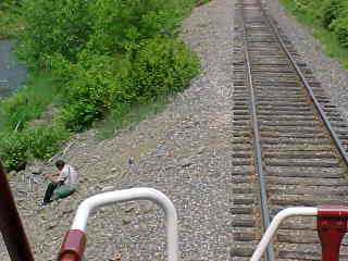 Just past Mohr, we spotted a trespasser on the track, who panicked. He did an end-over-end down the ballast and landed on his face. Today's lesson is "Always stay off railroad tracks!"