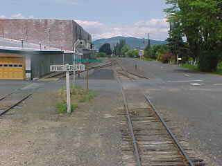 Pine Grove, Milepost 5.6. The train runs past a Diamond Fruit installation on the north side of Van Horn Drive, passes between the busy Pine Grove Grange Hall and Duckwall-Pooley's main plant on the south side, and near the Dominguez Family tortilla factory.