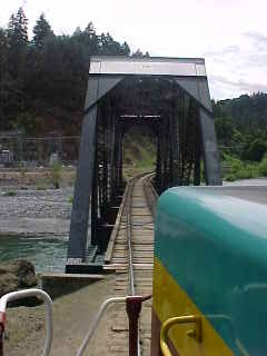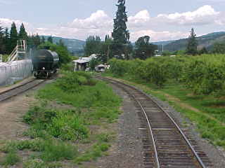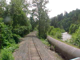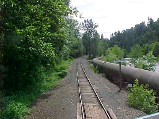 Beyond the plant, the railroad follows the huge penstock or pipeline that carries water to the generators from a dam upstream. Early trainmen told of leaks in the wooden pipe causing ice that had to be hacked from the tracks before the train couuld pass. Steel now has replaced most of the wooden pipe. Once providing all the electricity for the area, the plant furnishes only a minute portion of the power needed by Hood River businesses and homes today.