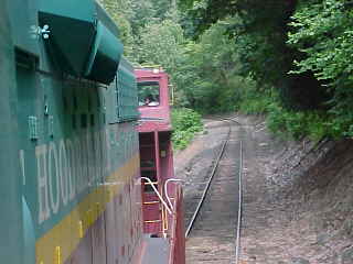 Jim on the open platform of Mount Hood Railroad open car "Lookout Mountain", nee Southern coach 1595 built by Pullman Company in 1923. Chris had arranged a cab ride back to Hood River for the two of us and soon we were welcomed into the cab of 02.
