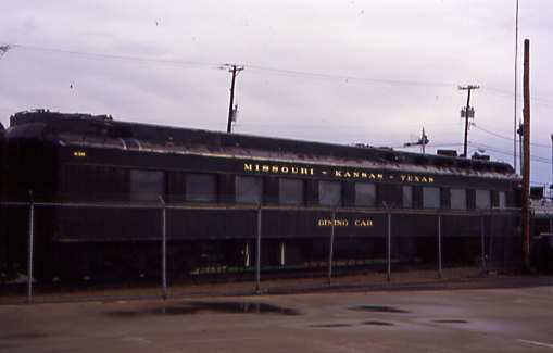 Missouri-Kansas-Texas Railroad 36-seat dining car 3, ex. Missouri-Kansas-Texas "Fort Worth", nee Missouri-Kansas-Texas 438 "Goliad" built by American Car and Foundry in 1937 and purchased by the museum in 1964.