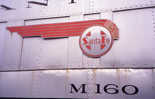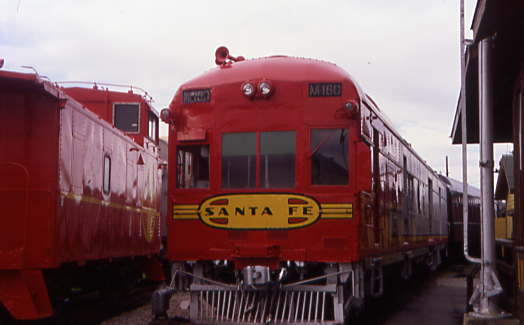 Santa Fe diesel-electric motorcar 160 built by Brill Motorcar Company in 1931 as a 535 hp gas-electric combined baggage/motor car which was generally coupled to one or two passenger coaches when in service. Originally painted with a zebra-striped front,M-160 was eventually repainted in the renowned red, yellow and silver Santa Fe "Warbonnet" scheme. It underwent major rebuilds in 1948 and 1952, when it was fitted with a diesel engine and components from AT&SF's first E-1 passenger locomotive.