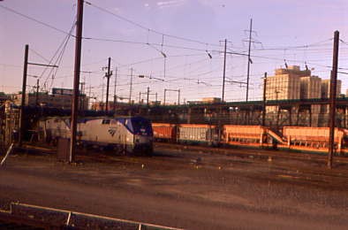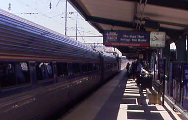4/18/2006 A 6:15 AM wake-up call started me off for the day. The hotel bill was under the door so I returned the key to the front desk of the Holiday Inn Express, an excellent hotel in which to stay in Philadelphia. I then walked to the Market East SEPTA station, stopping at Dunkin' Donuts along the way, bought a SEPTA Center City ticket and rode the R3 Elwyn train back to 30th Street Station where I sat on the bench in the Grand Hall until the Solari Board showed my track number.