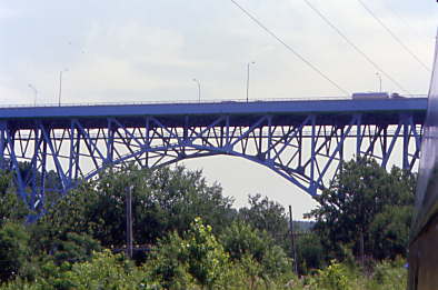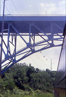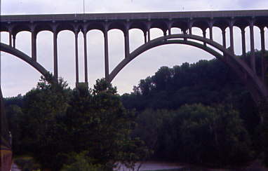 In the background is the Brecksville-Northfield High Level Bridge, a five-span open-spandrel arch bridge, which carries Ohio Route 82 over the Cuyahoga River in Cuyahoga and Summit Counties. Designed by county engineer A.M. Felgate, the bridge was built in 1930-31 by the Highway Construction Company and was rehabilitated in 1989.