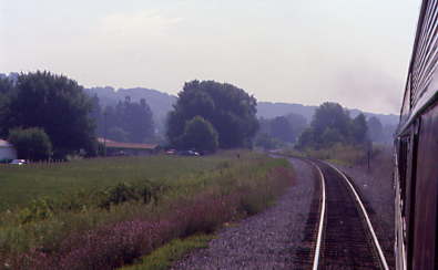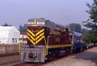Beyond the switch and 7220, now being short hood forward, coupled onto the west end of our train to lead us back.