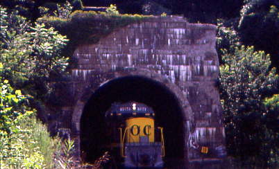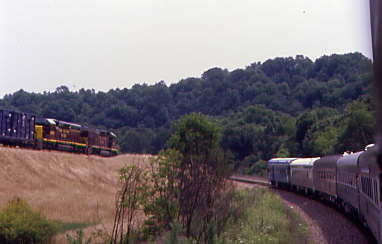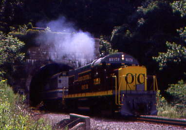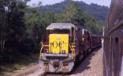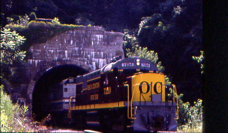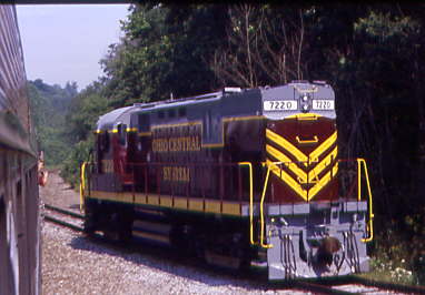 Before Gould Tunnel was a spur on which sat Ohio Central F40PH 271, nee Amtrak 271 built by Electro-Motive Division in 1977. Once past the spur, we stopped, C420 7220 was uncoupled and 271 came out onto the mainline and pulled the train backwards until it cleared the switch. Once clear, 7220 reversed onto the spur and 271 pushed us forward.