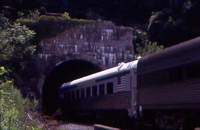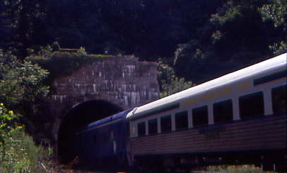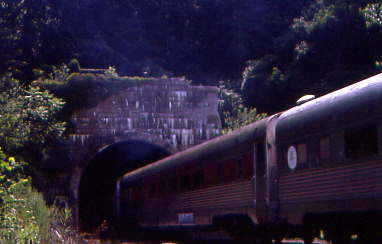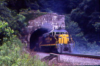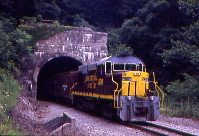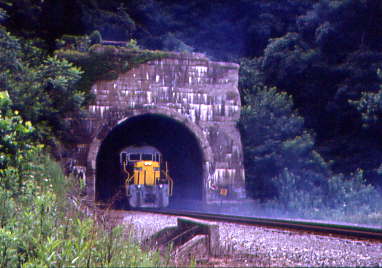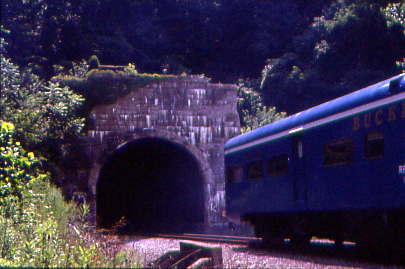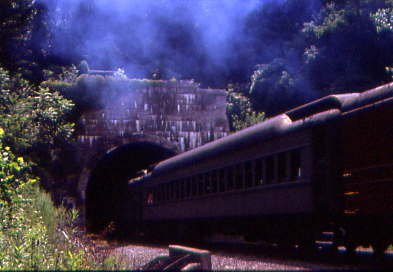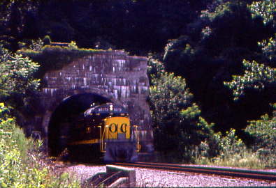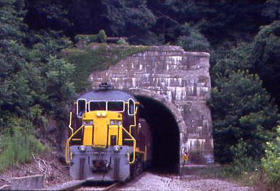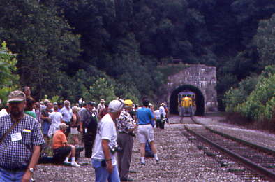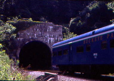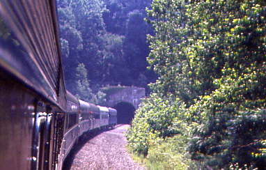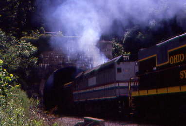 The excursion today will continue to Gould Tunnel near Mingo Junction. This is the longest tunnel in the state of Ohio, easuring over half a mile in length. Operating conditions permitting, you will be able to detrain and observe the west portal and the opening that once housed large fans to draw smoke from the tunnel during the days of steam. Gould Tunnel was bored as part of numerous line changes carried out by PRR in this area intended to ease curves and grades. Many other changes are visible through the trees, including several tunnels and bridges. Except for the tunnel which contained a gauntlet track arrangement in later years, the Panhandle was a double track railroad.