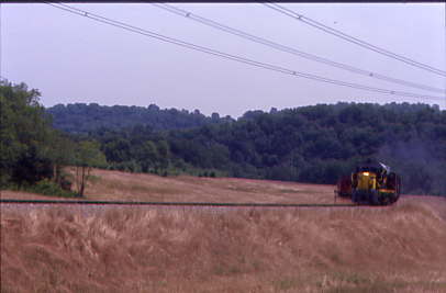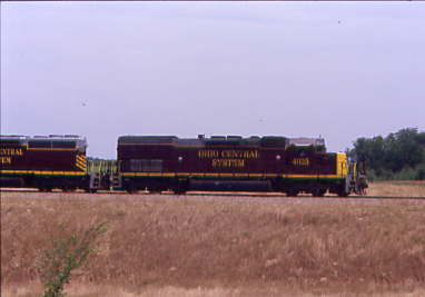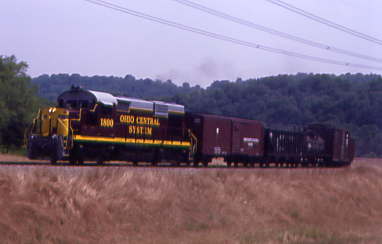 The Ohio Central Railroad currently operates the Panhandle from Columbus to Mingo Junction, Ohio. They began operating the line in 1993 after taking over from Conrail. Freight traffic over the line has steadily increased including two daily unit coal trains running to the American Electric Power Company plant on the west side of Coshocton. At Bowerston, the Wheeling and Lake Erie mainline is merged with the OC as far as Jewett. The two lines were literally next to each other for the approximate 10 miles between these two points. The old W&LE right-of-way is visible on the north side of the train. Both railroadss handle coal from two branch lines to the south.