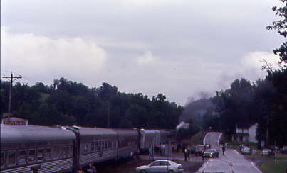 Ohio Central 1293 waited to reverse onto the front of our train and I boarded, very glad to be out of the rain and found that the car host in Pennsylvania Railroad coach RPCX 101 had saved some seats for us so I grabbed one for Chris and I. While I was doing that, 1800 and 471 cut off our train and went to the track on which Ohio Central 1293 was. Next, 271 pulled us down past the switch before Ohio Central 1293 and friends reversed onto our train. With us now facing the correct direction for Brewster, we departed.