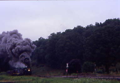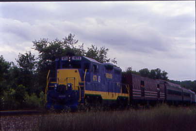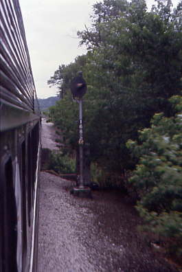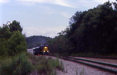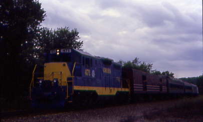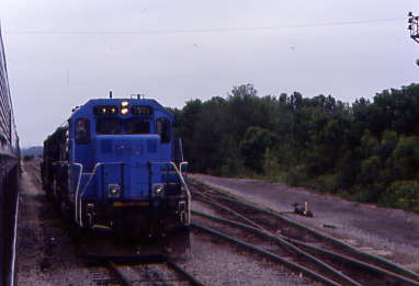 Arriving at Bowerston, where we stopped to change the position of our engines. First the engines cut off from the train, then 1800 cut off and went west onto the Ohio Central tracks. That was followed by 471 which reversed onto our train again and pulled us onto the Ohio Central mainline.